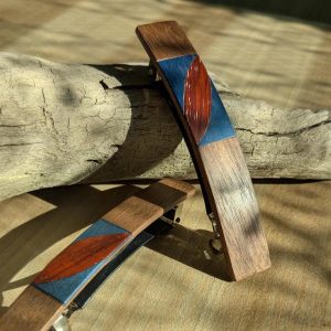 Handmade French Barrette Hair Clip – Walnut and Padauk Wood with Blue Veneer Inlay