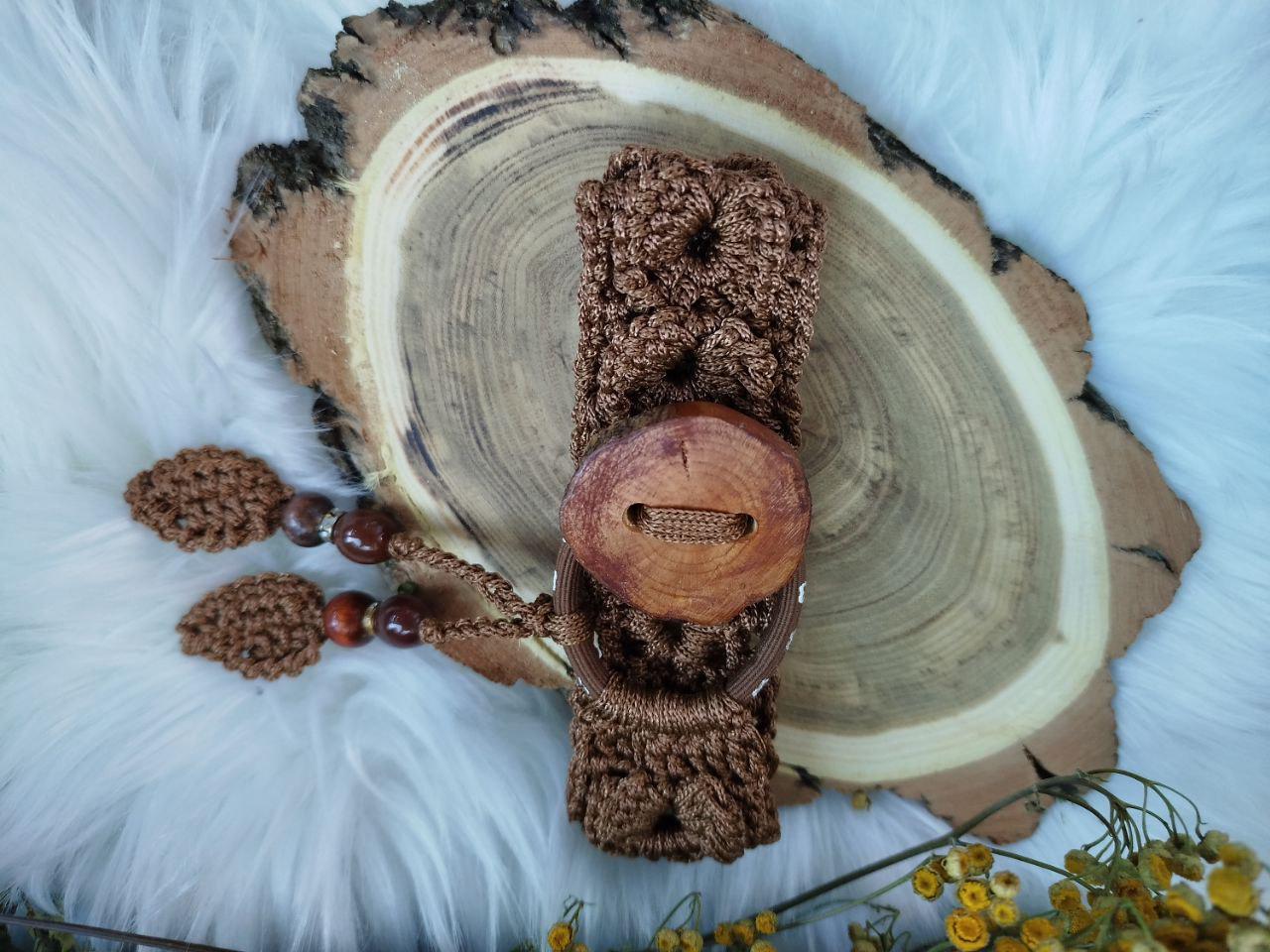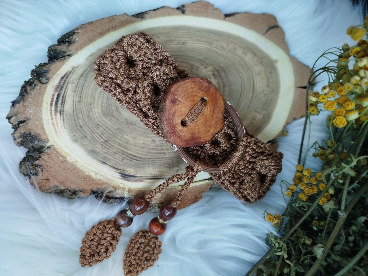 Handmade boho-style hair tie crafted with delicate crocheted lace, a rustic wooden button, and a sturdy rubber band. Adds a natural bohemian touch to any bun or updo. Each piece is individually handmade, so minor variations in lace pattern and button tone are natural. Comfortable, lightweight, and gentle on hair. Perfect for everyday wear or as a thoughtful handmade gift.