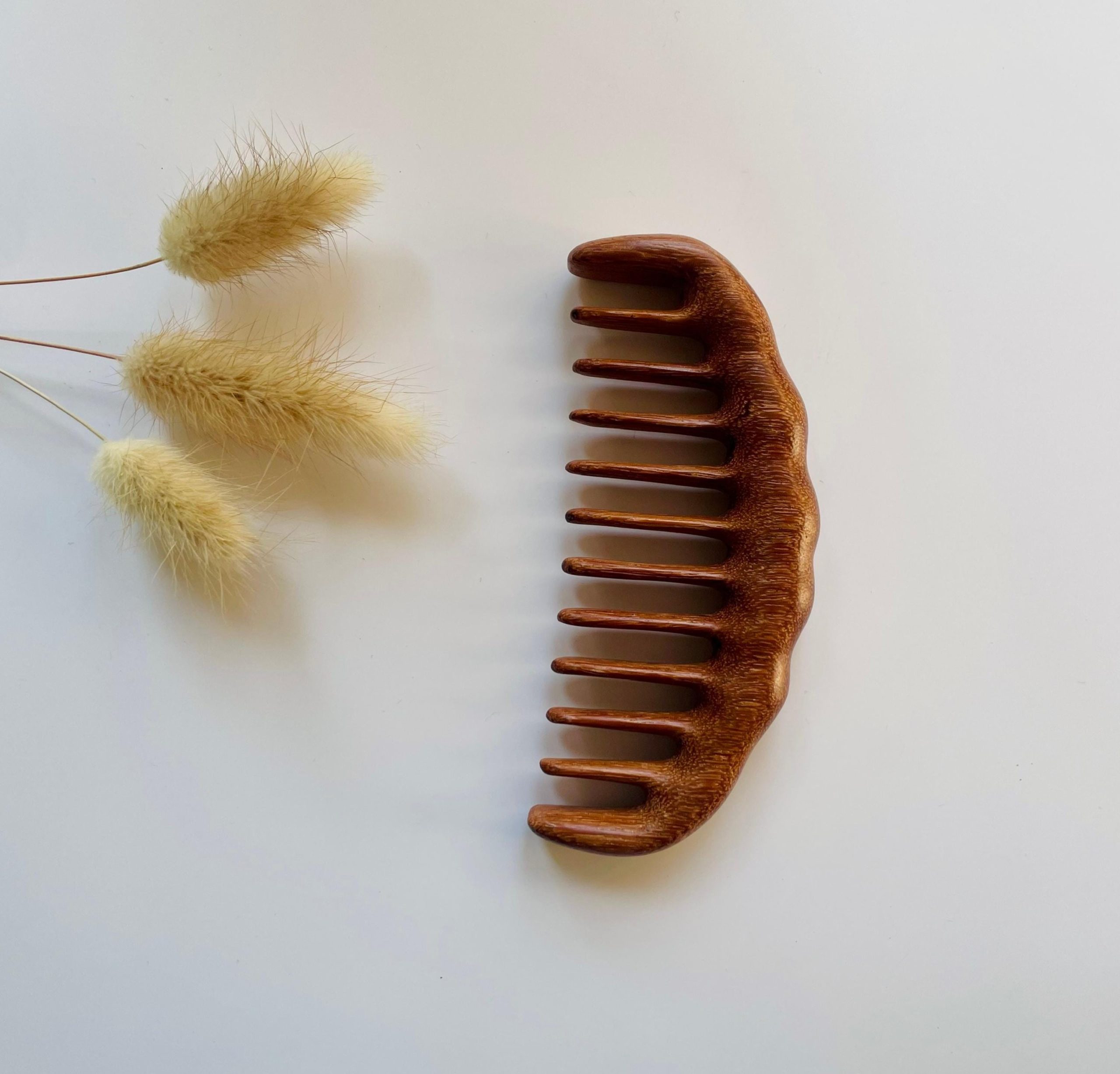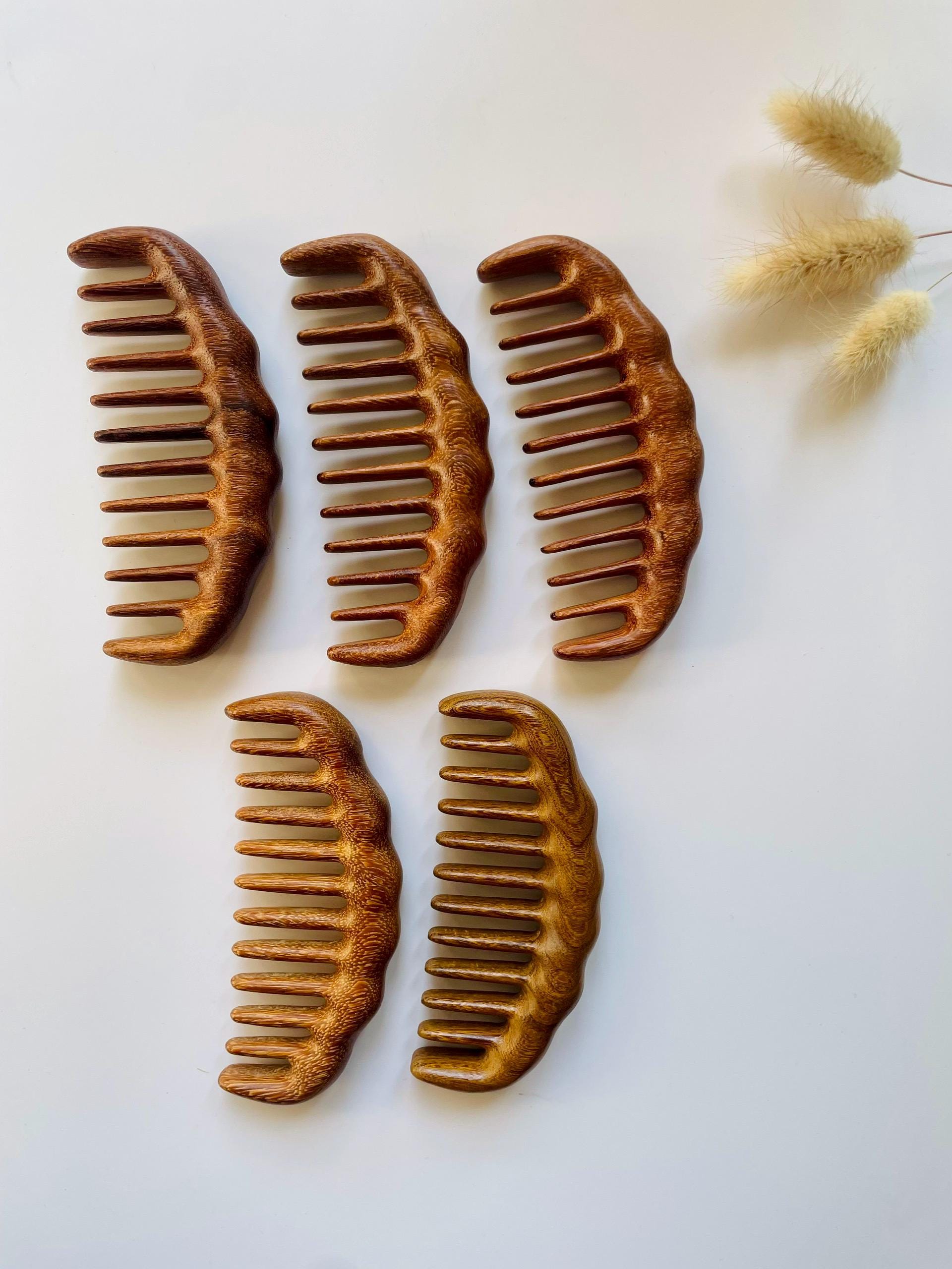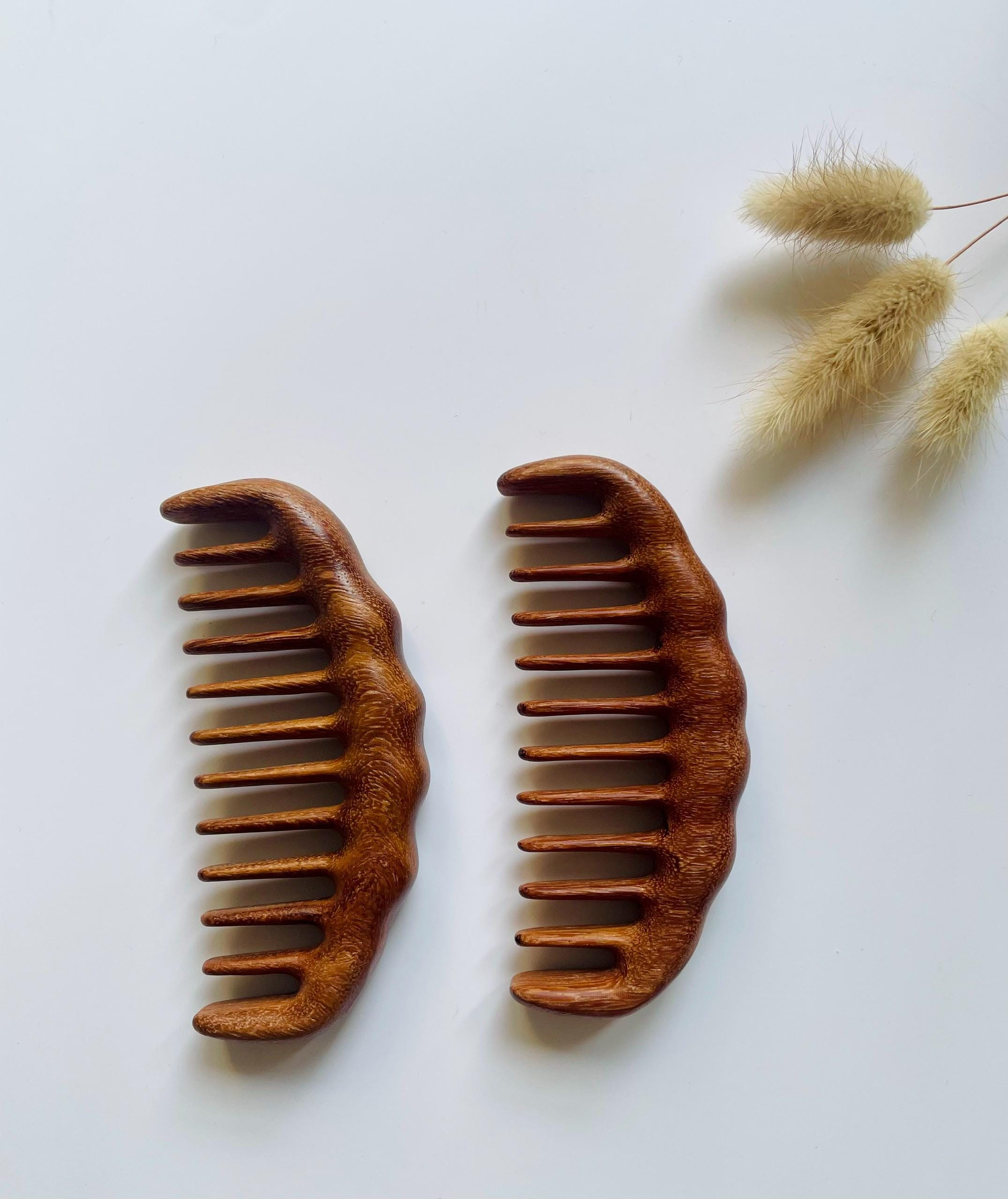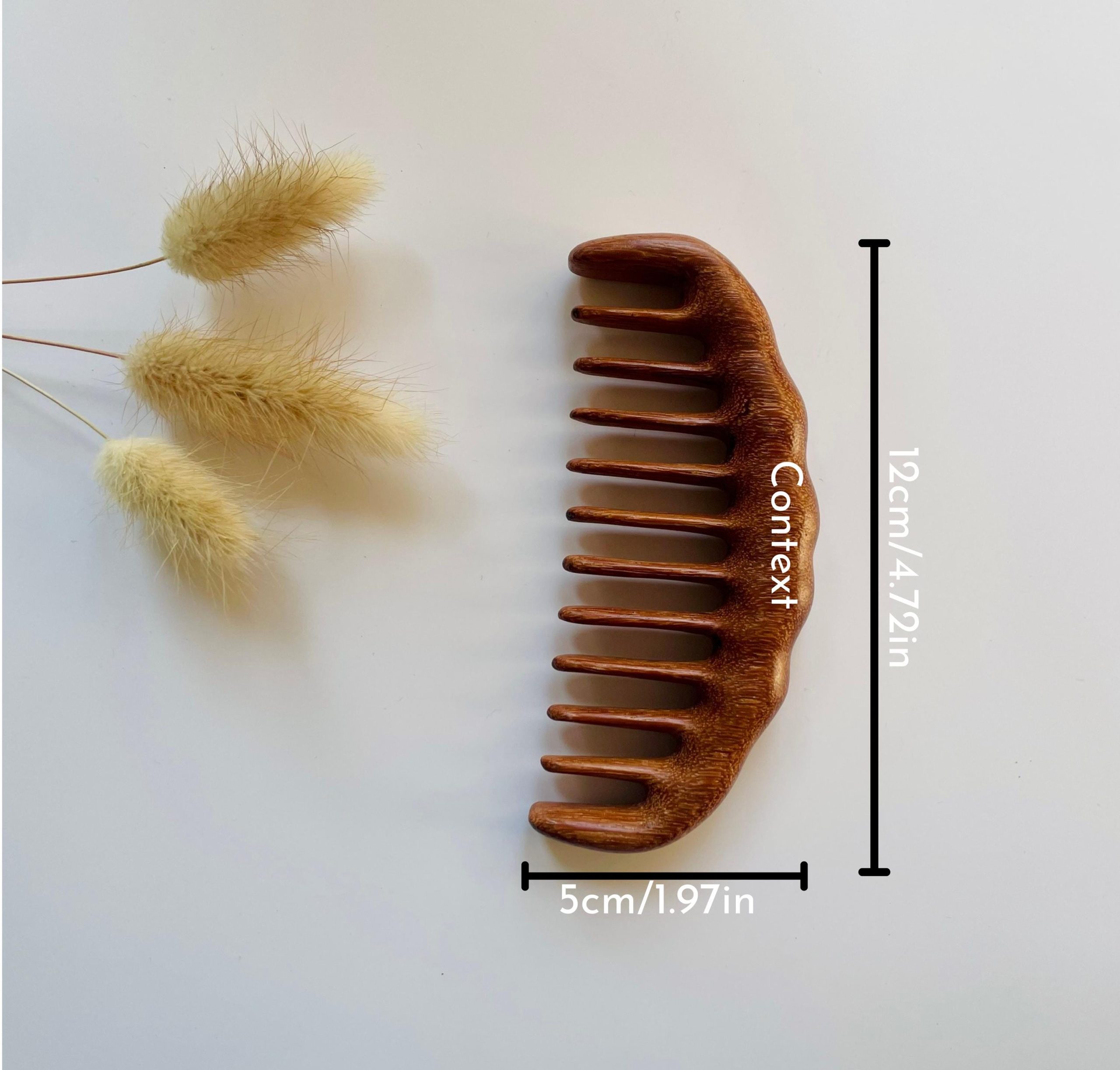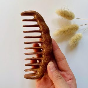 Anti-static wooden hair comb handcrafted with fine engraved detailing. Smooth wooden teeth reduce frizz and static while gliding gently through hair. Made from natural wood with a hand-polished finish. Each comb has its own unique wood grain pattern and subtle natural scent. Suitable for all hair types. A practical and elegant addition to any daily hair care routine.