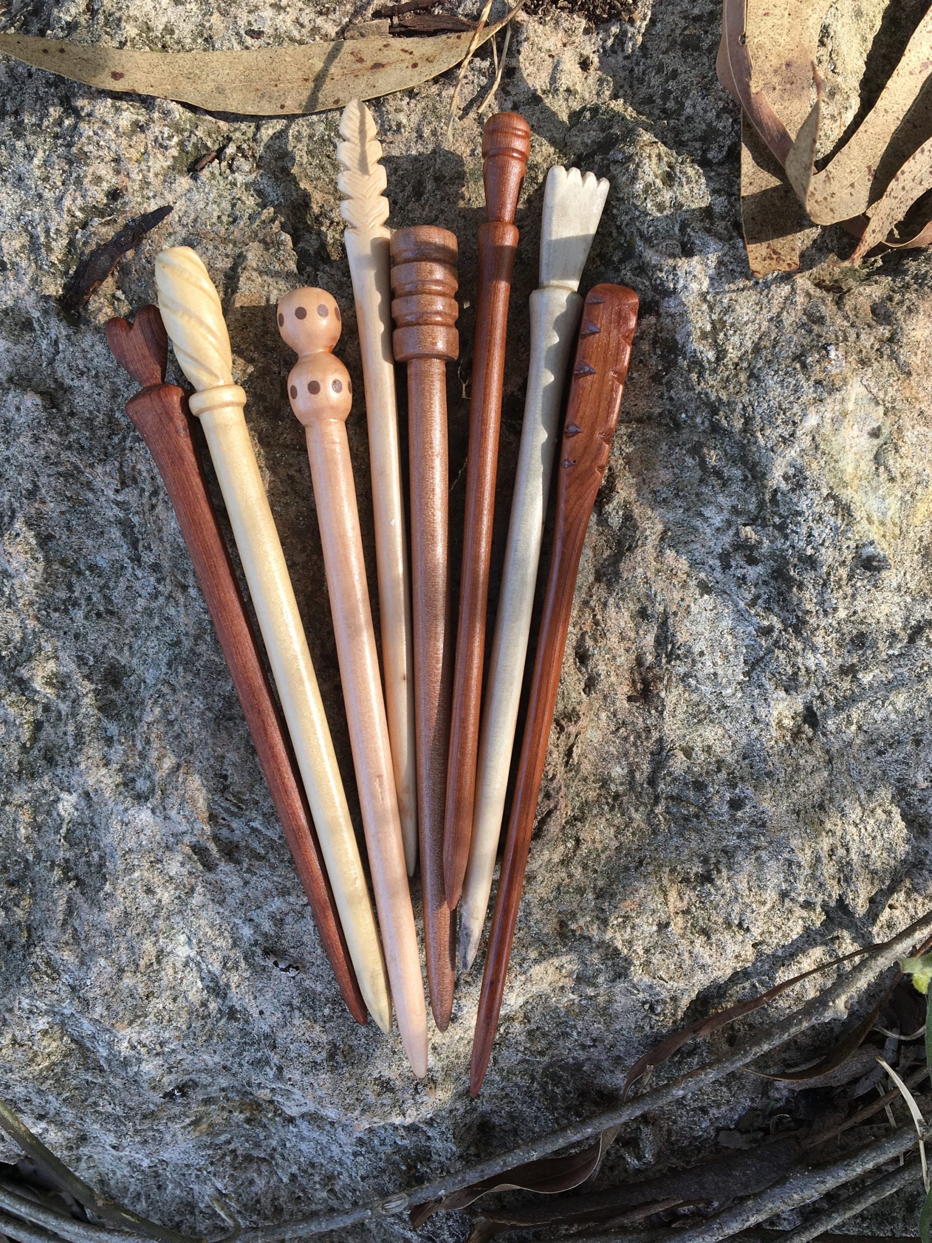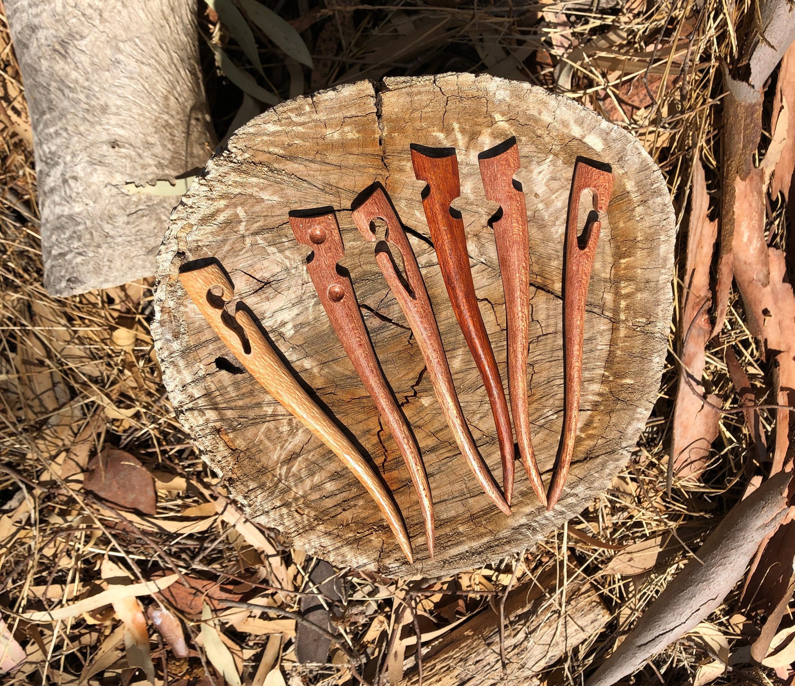 Set of three hand-carved wooden hair pins, each individually crafted from locally sourced timber in South East South Australia. Each pin is unique in shape and wood grain. Smooth finish suitable for daily use and comfortable to wear. A thoughtful artisan hair accessory handcrafted by an experienced woodcarver. Minor variations between pieces reflect the handmade nature of each item.