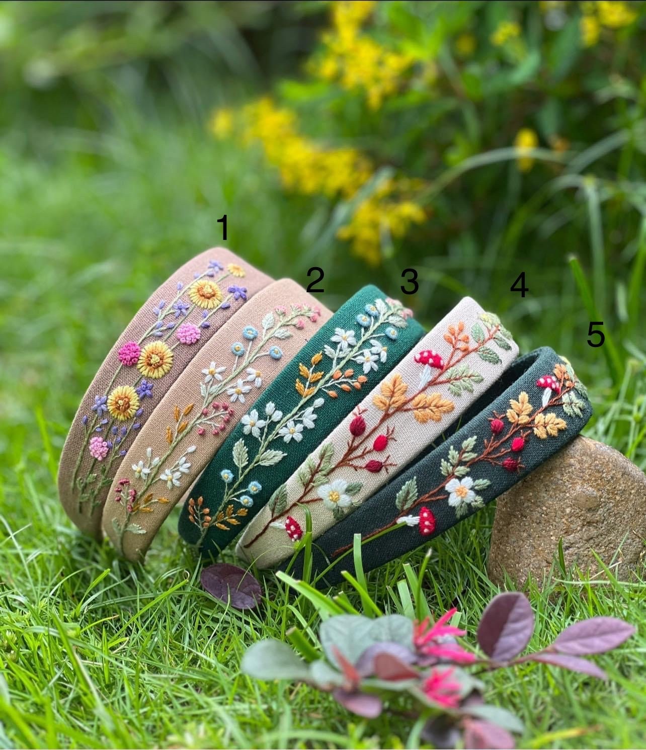 Linen headband with intricate hand-embroidered floral and daisy motifs. Crafted to fit comfortably on all head sizes. Embroidery covers one side of the headband for a decorative finish. Made from high-quality linen fabric with durable cotton embroidery thread. Each piece is individually handmade. A stylish and artisan hair accessory for everyday wear.