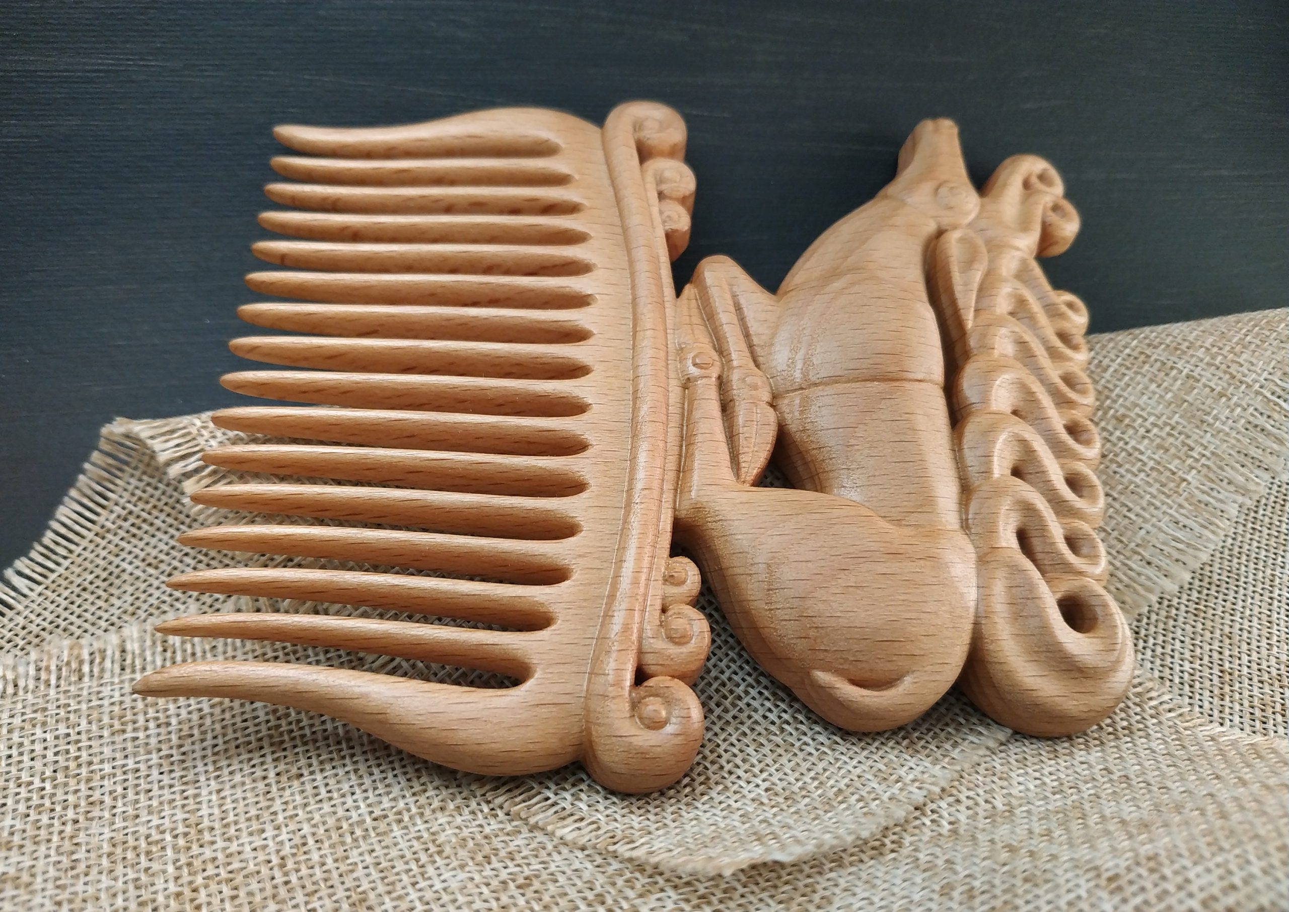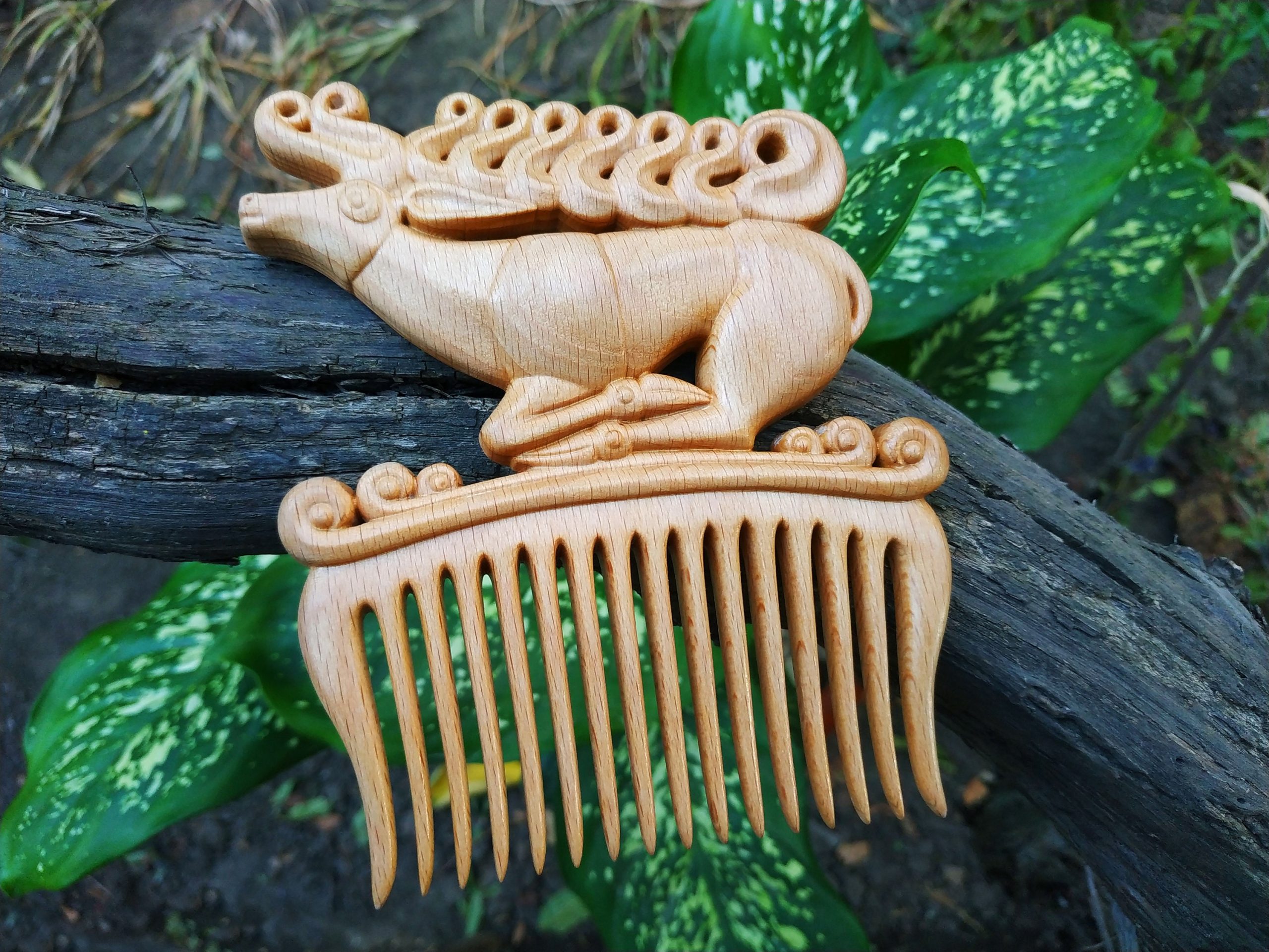 Handmade Beech Wood Deer Hair Comb – Scythian Art Carved Wooden Hair Accessory