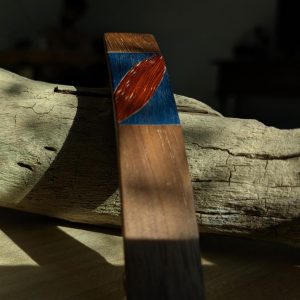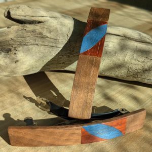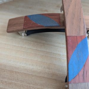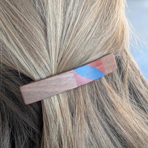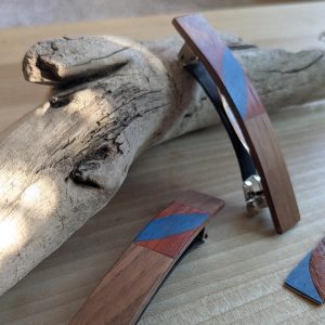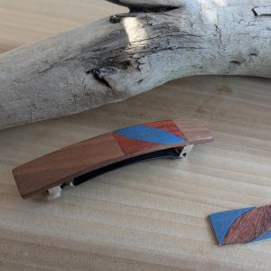 Be the first to review “Handmade French Barrette Hair Clip – Walnut and Padauk Wood with Blue Veneer Inlay” Cancel reply