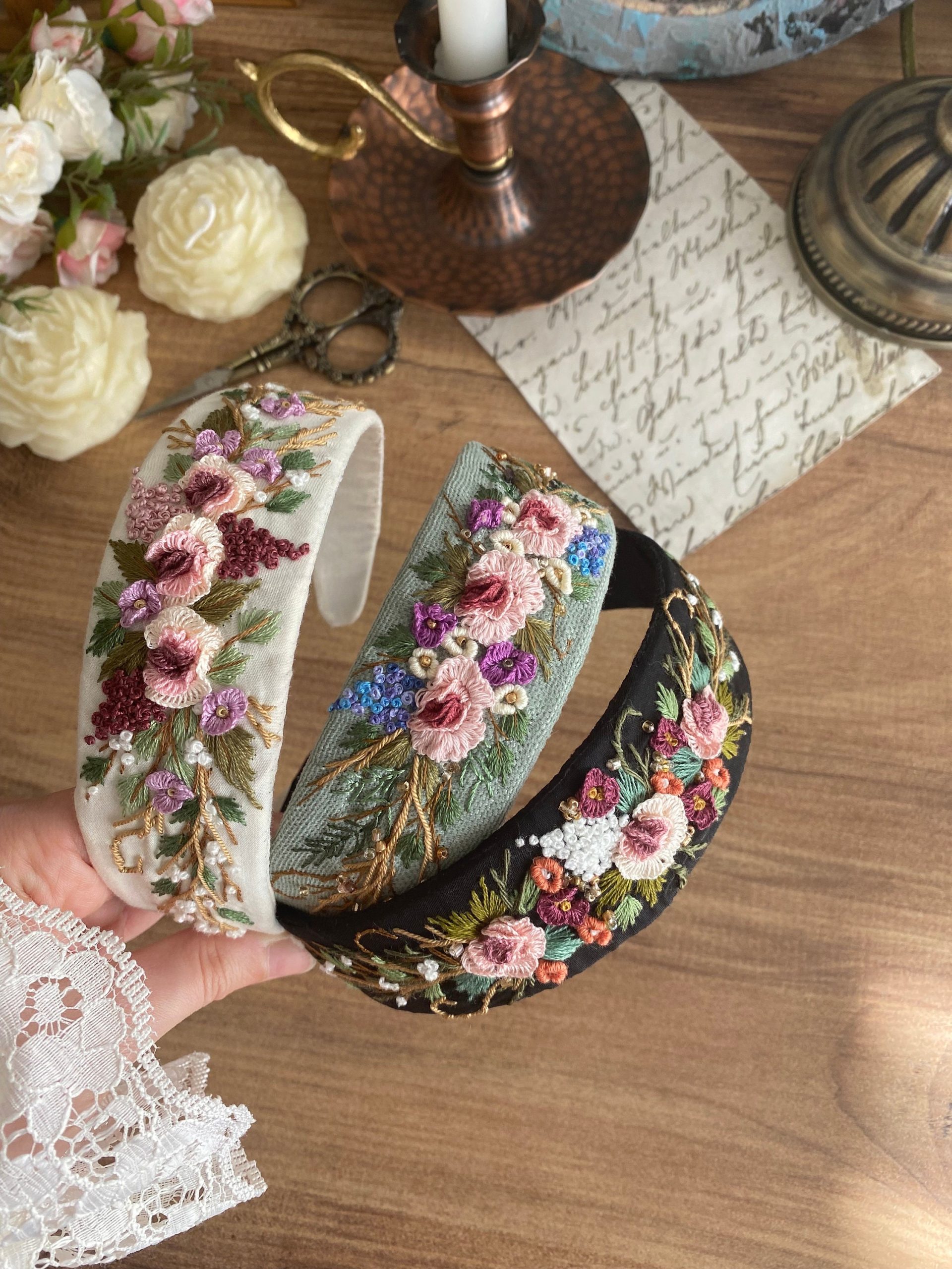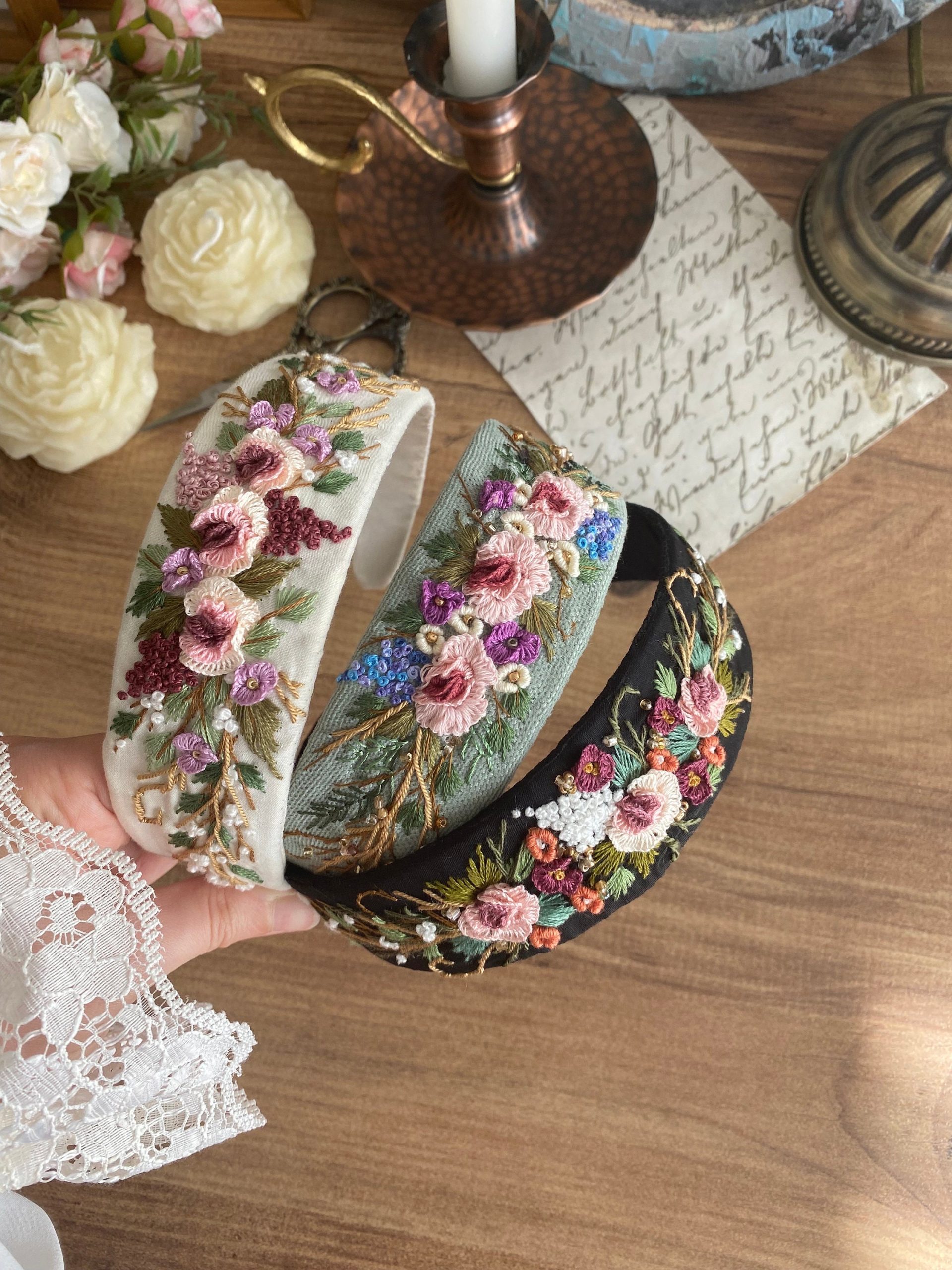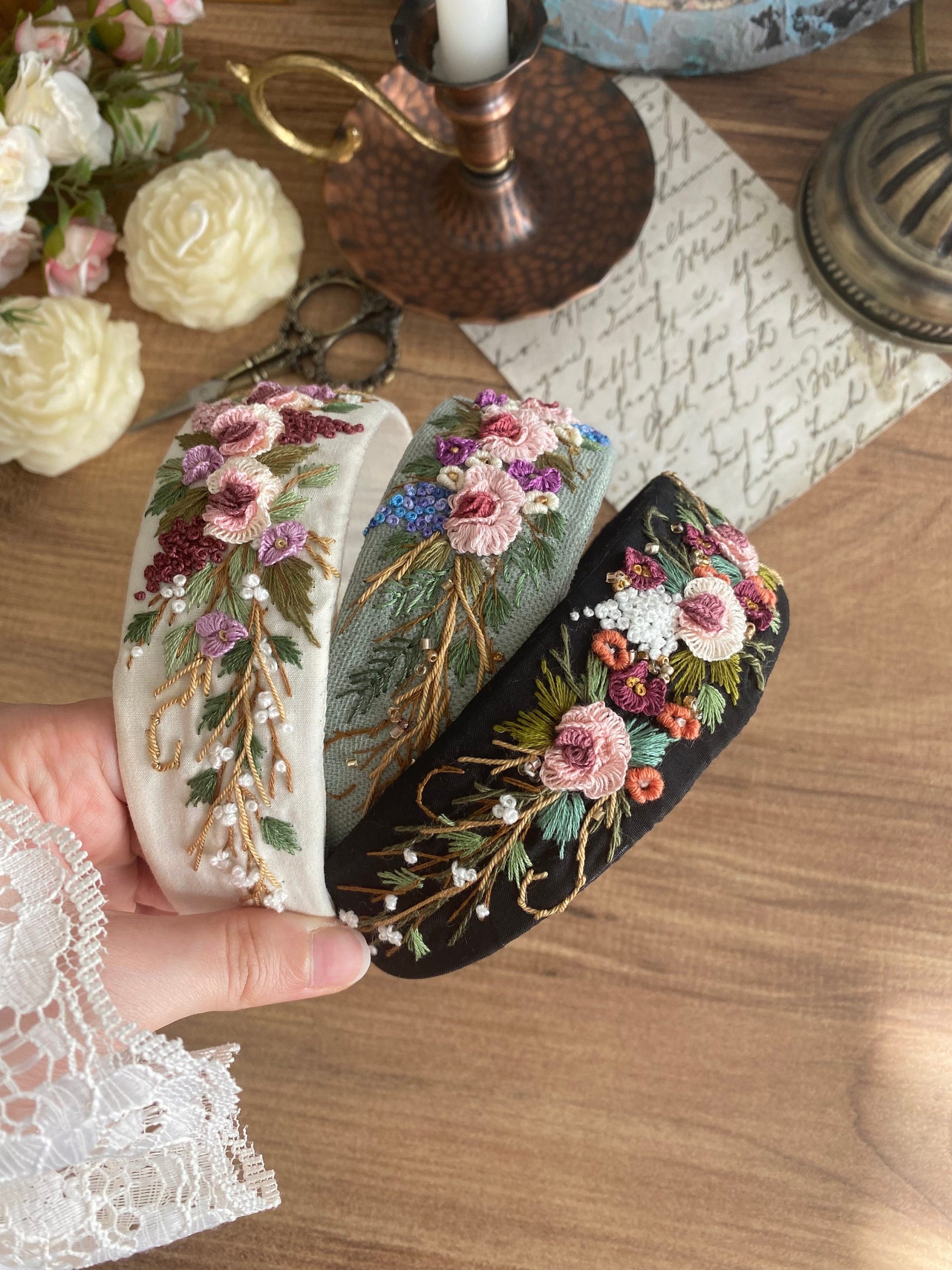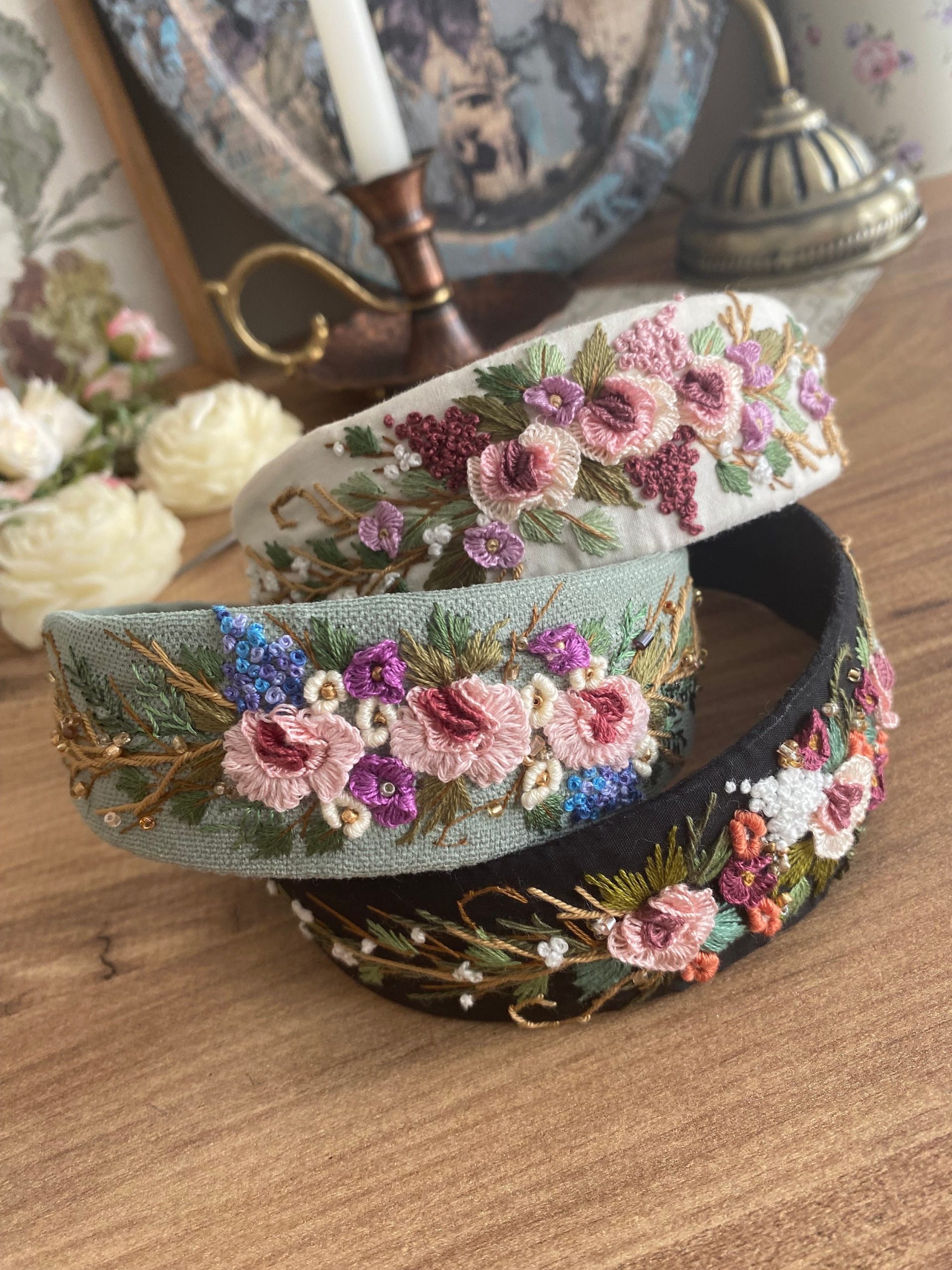 Handmade Floral Embroidered Linen Headband – Hand Stitched Hairband for Women