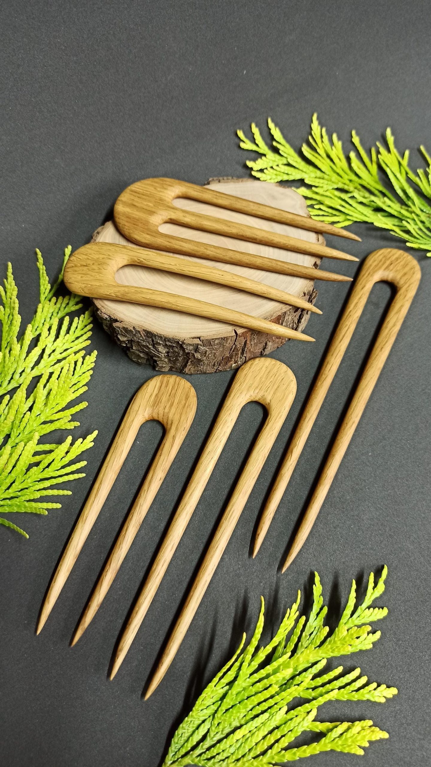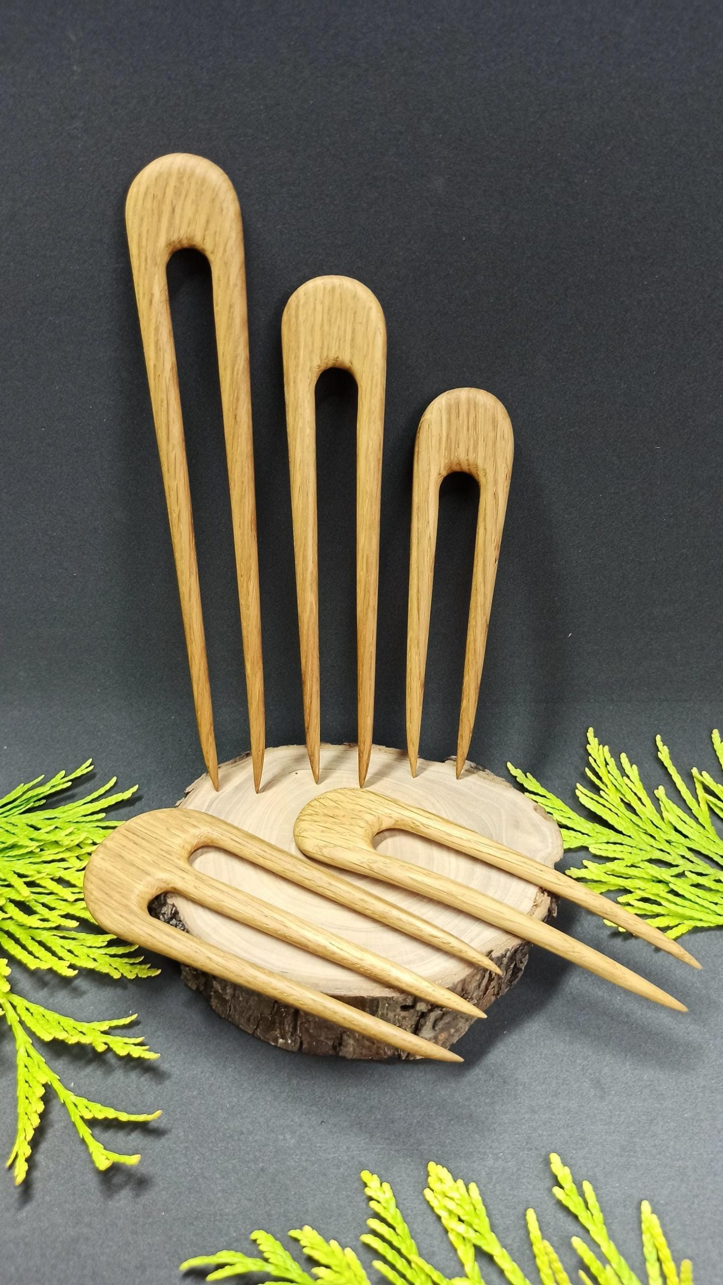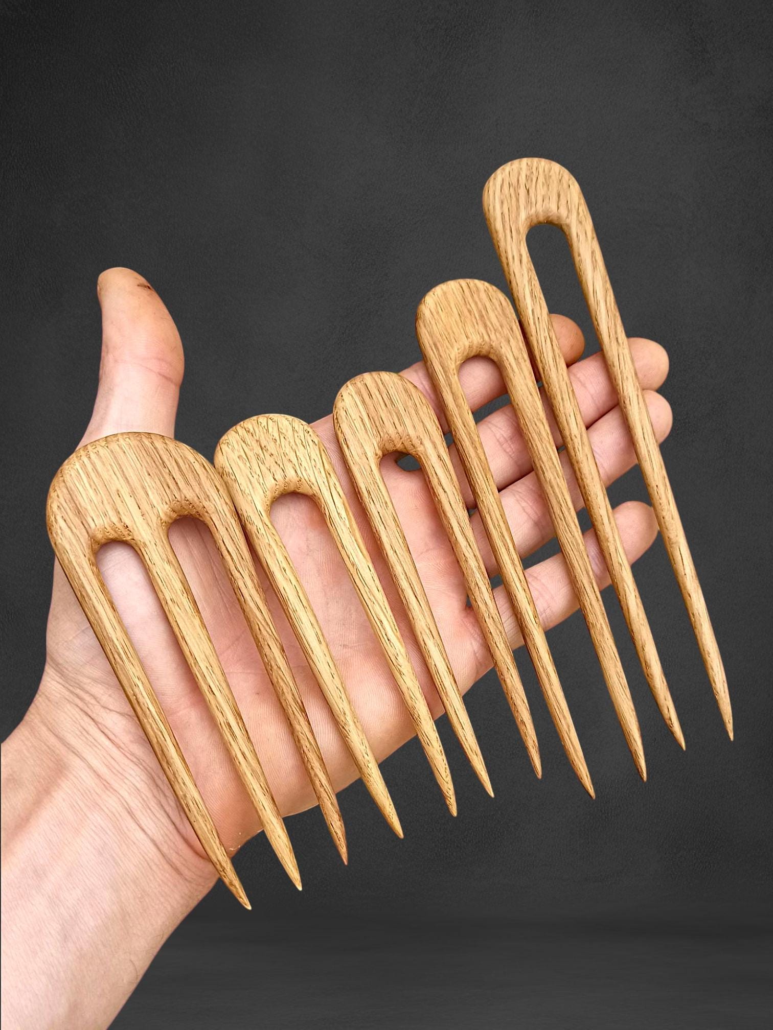Complete set of five hand-carved minimalist oak wood hair forks in a U-shaped design. Includes a range of sizes from large full-bun forks to smaller pins for half-up styles. Each fork is individually carved from durable oak wood with a smooth, snag-free finish. Suitable for all hair lengths and thicknesses. A versatile set of natural handmade hair accessories.