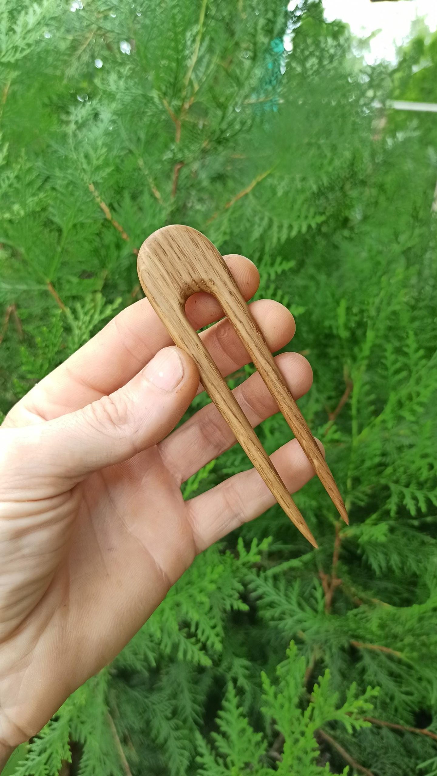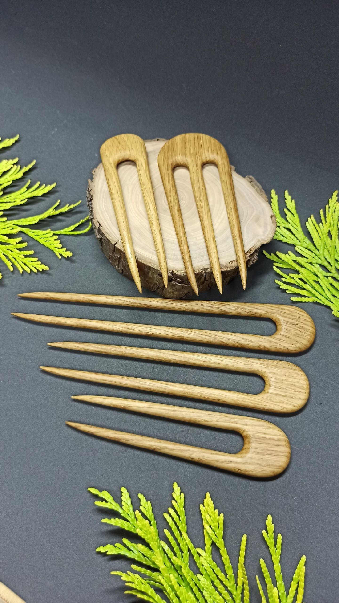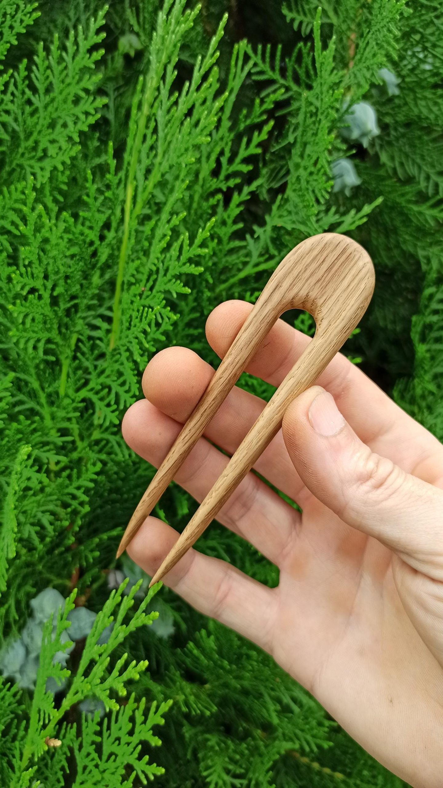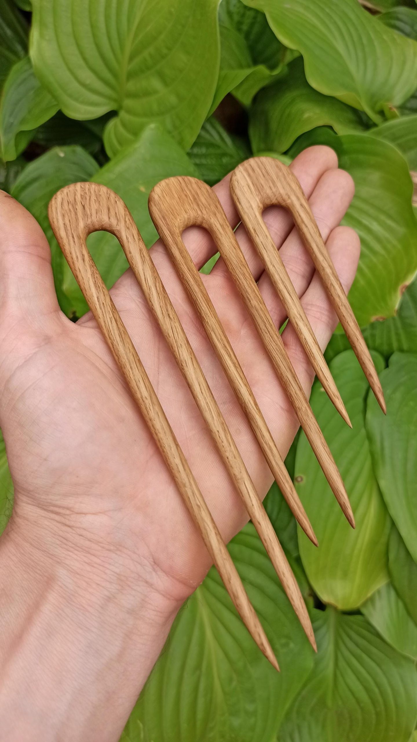 Complete set of five hand-carved minimalist oak wood hair forks in a U-shaped design. Includes a range of sizes from large full-bun forks to smaller pins for half-up styles. Each fork is individually carved from durable oak wood with a smooth, snag-free finish. Suitable for all hair lengths and thicknesses. A versatile set of natural handmade hair accessories.